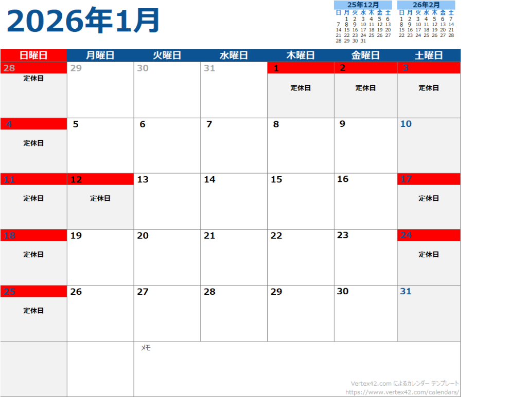 2026年1月カレンダーのお知らせです